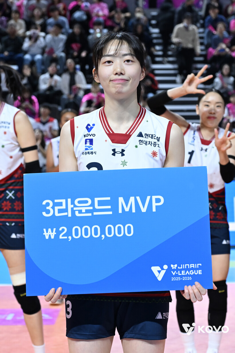 현대건설 세터 김다인은 이날 경기에 앞서 3라운드 최우수선수(MVP)에도 선정됐는데 팀도 승리를 거둬 기쁨이 두배가 됐다. 그는 경기 후 현장 취재진과 가진 인터뷰를 통해 "크리스마스 유니폼을 앞으로 더 입었으면 좋겠다"고 웃었다.