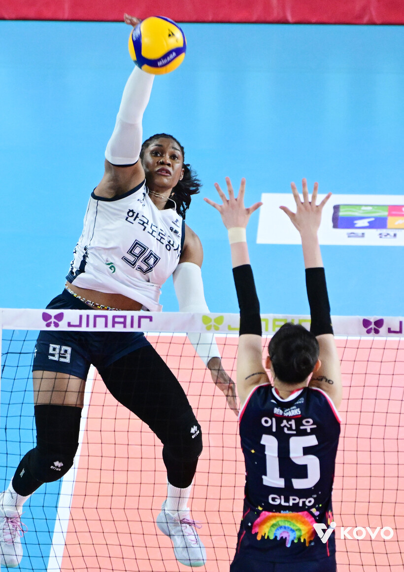 한국도로공사는 1, 2세트를 연달아 가져오며 손쉽게 승리를 거두나 했으나 정관장 반격에 고전했고 풀세트까지 가는 접전 끝에 3-2(25-23 25-23 17-25 19-25 15-12)로 이겼다.