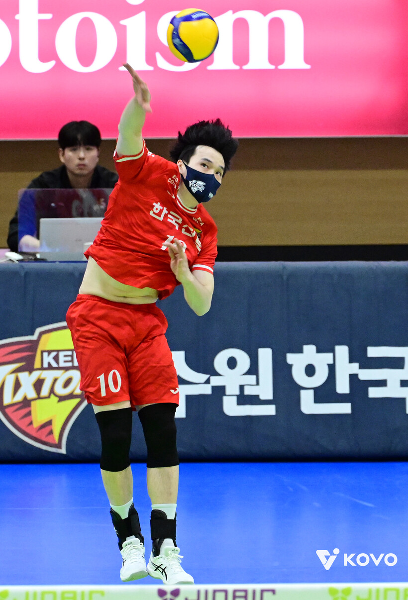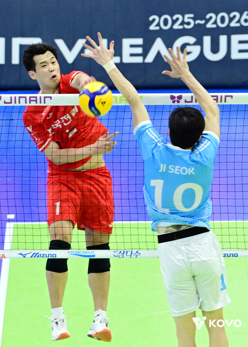 한국전력 승리 주역은 '주포' 베논(캐나다)과 김정호다. 베논은 두팀 합쳐 가장 많은 18점을 올렸다. 감기로 인해 마스크를 착용하고 코트로 나온 김정호는 서브 에이스 3개를 포함해 14점으로 뒤를 잘 받쳤다.