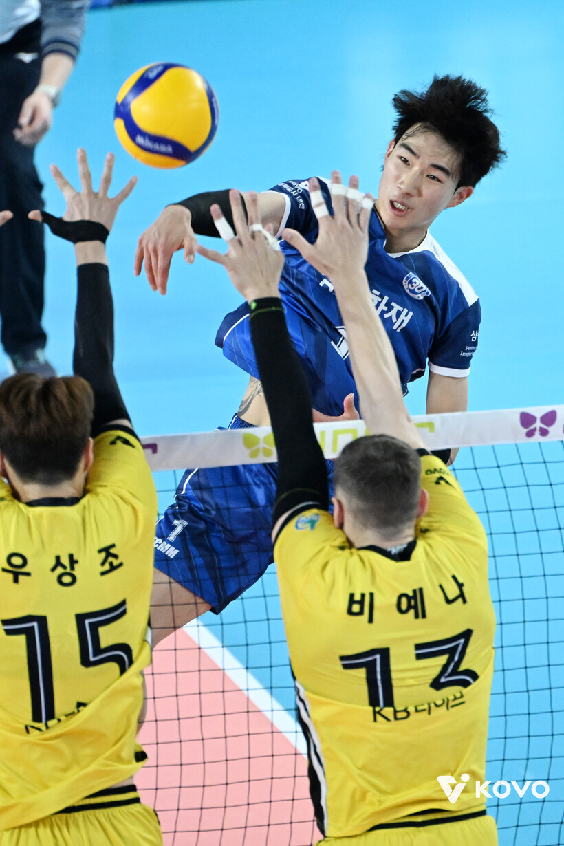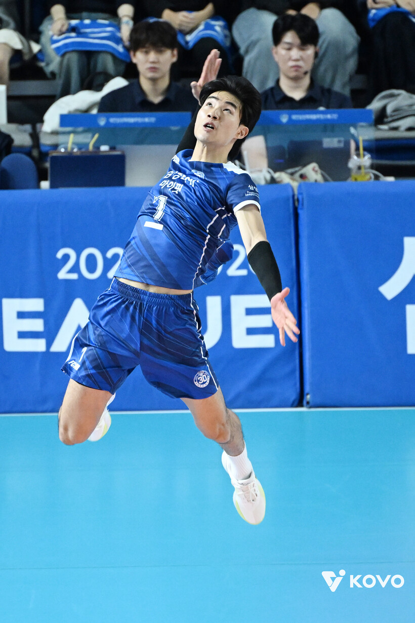 주인공은 아웃사이드 히터 김우진이다. 그는 지난 8일 대전 충무체육관에서 열린 KB손해보험과 2025-26시즌 진에어 V-리그 1라운드 팀의 마지막 경기에서 제몫을 했다.