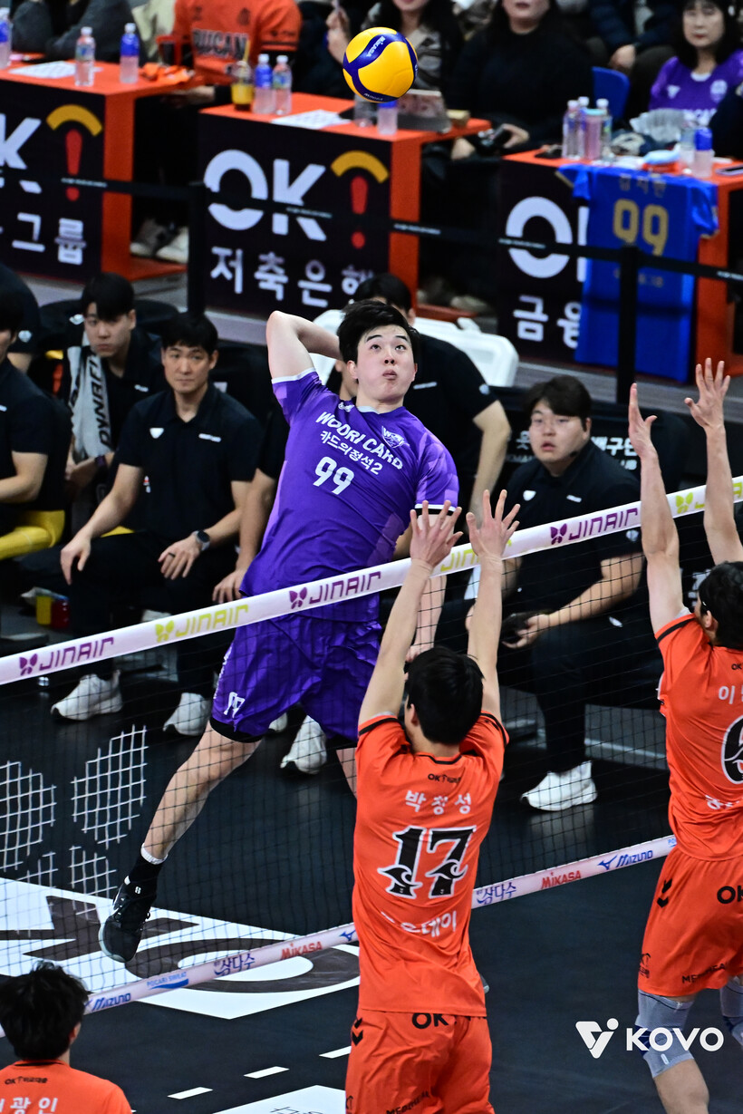 패배 위기에서 벗어난 우리카드는 흐름을 탔다. 아라우조의 후위 공격에 이어 김지한이 OK저축은행 송희채가 때린 후위 공격을 블로킹으로 잡아내며 10-5로 점수 차를 벌렸고 이상현과 조근호도 연달아 가로막기에 성공, 우리카드는 13-6까지 치고 나가며 승기를 굳혔다.