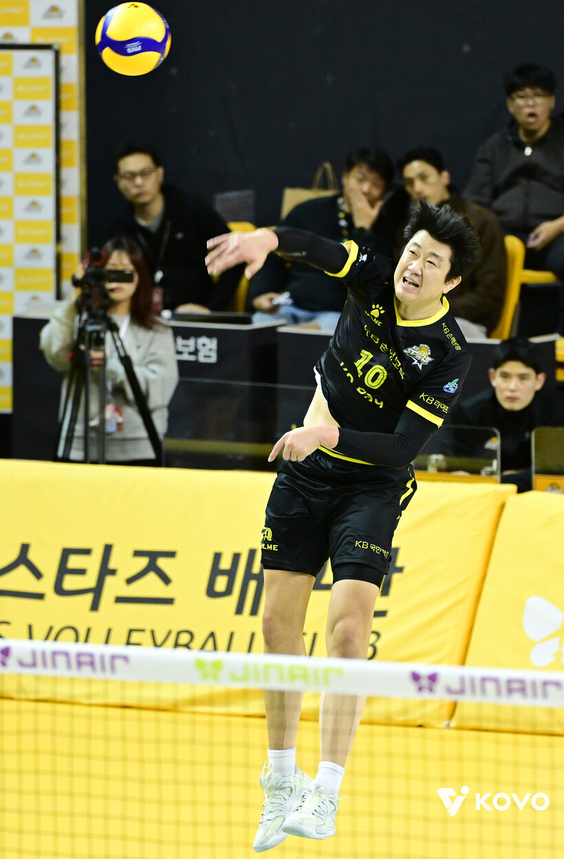 남자프로배구 KB손해보험 아웃사이드 히터 나경복이 V-리그 기준 기록상에 이름을 올렸다. 나경복은 지난 11일 안방인 의정부 경민대체육관에서 열린 한국전력과 2025-26시즌 진에어 V-리그 팀의 1라운드 마지막 경기에서 서브 에이스 2개를 성공했다.
